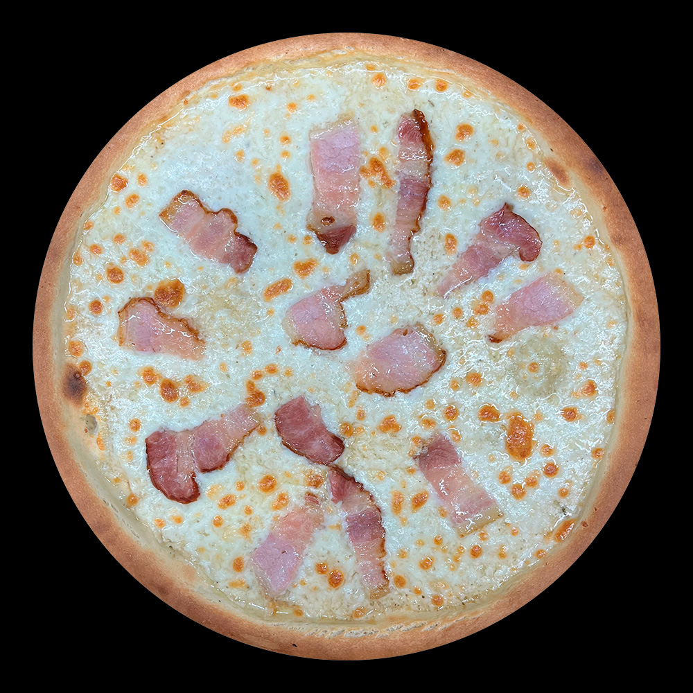 Сочная пицца с беконом, моцареллой, пармезаном.