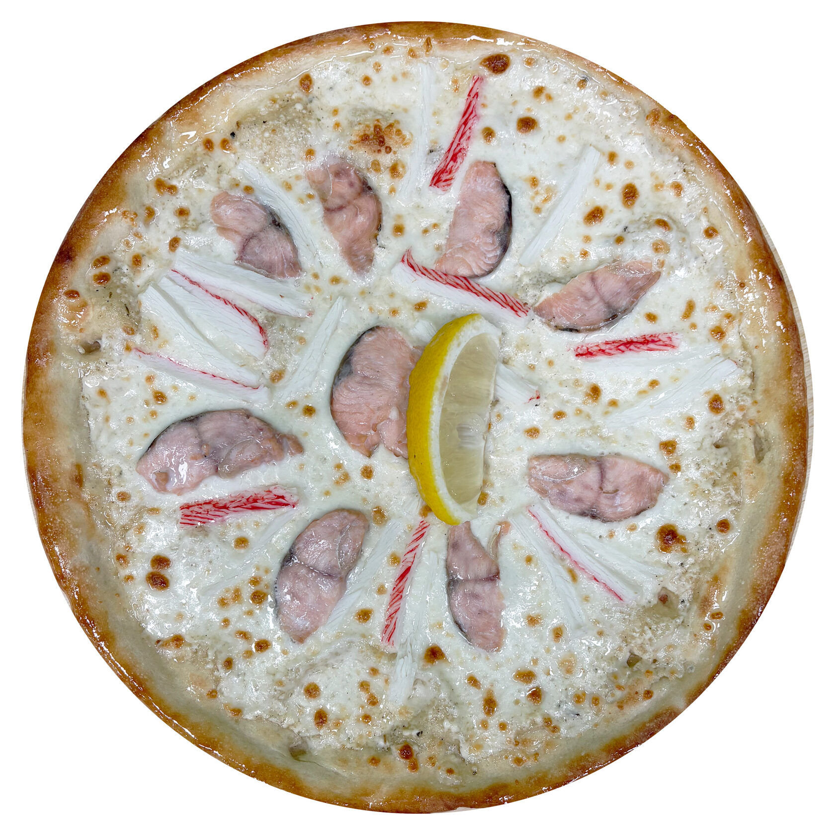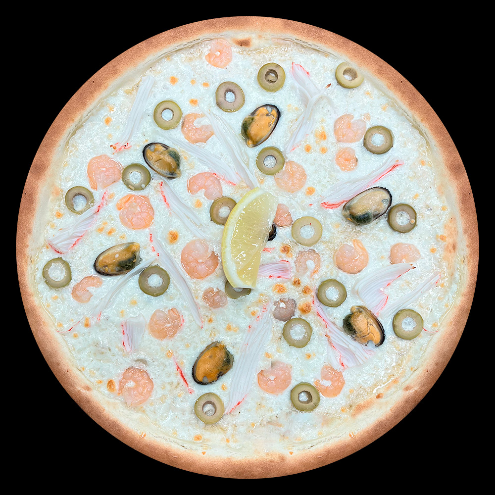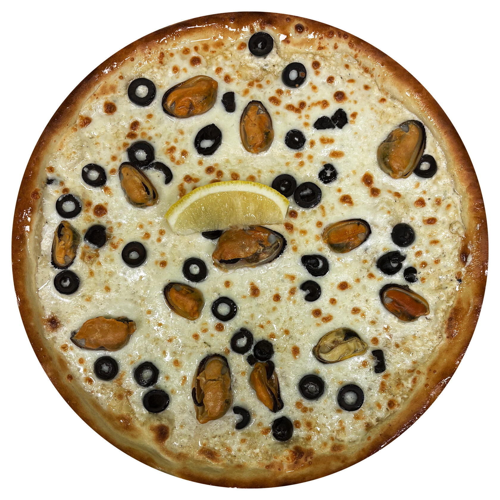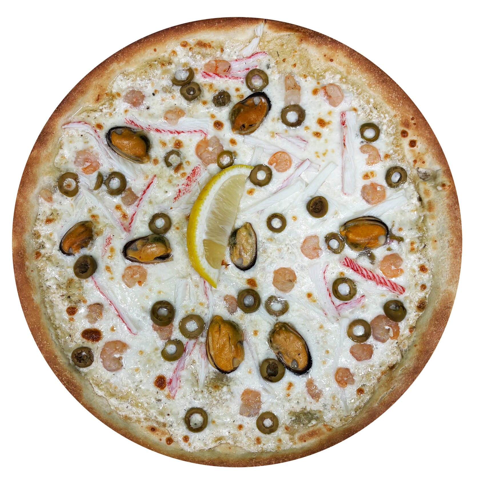 Фирменная пицца нашей команды для любителей морепродуктов.В составе мидии,креветки, оливки и снежный краб,политая соком лимона по желанию вызывает восторг у всех гостей