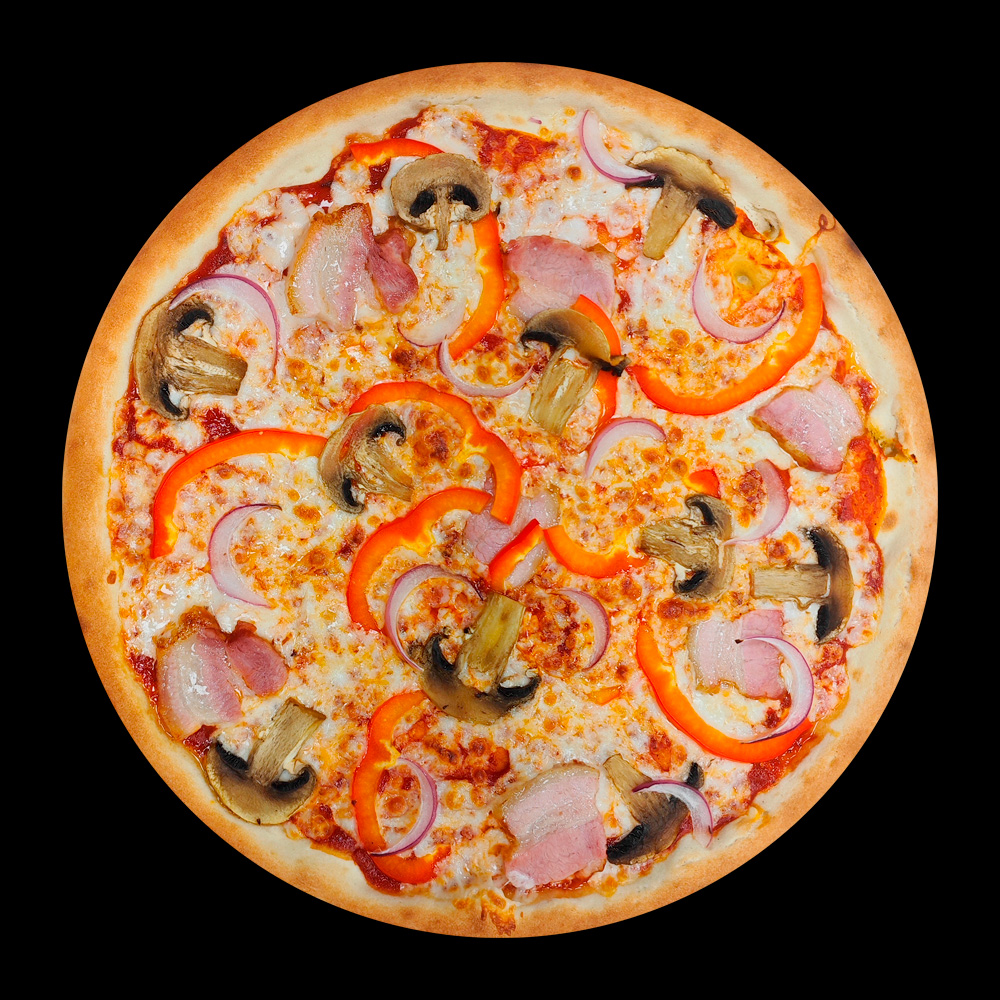 Ароматная новинка на основе бекона, болгарского перца, шампиньонов и ялтинского лука на хрустящей основе нашего аппетитного теста!