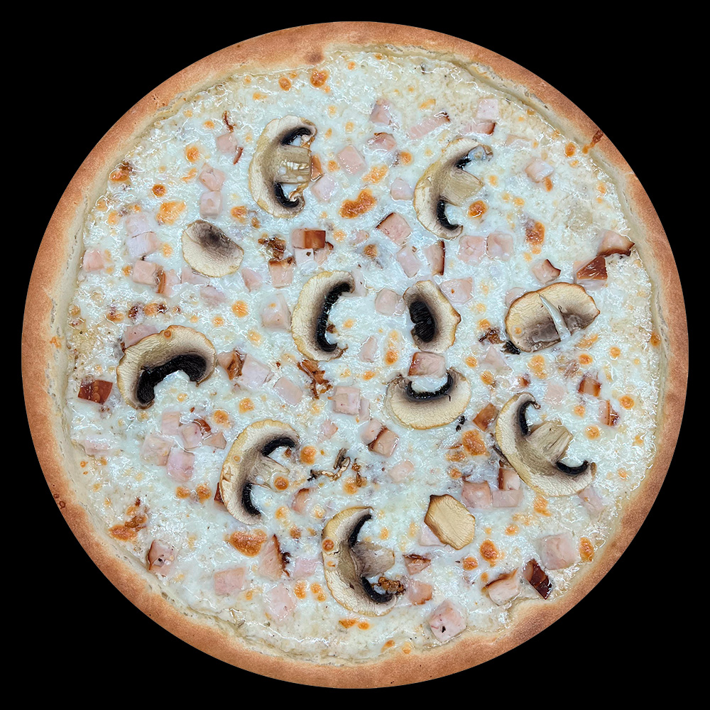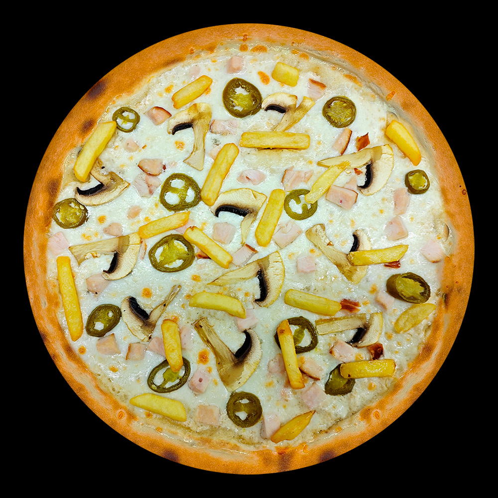 Нежная пицца на тонкому тесте. белый соус, моцарелла, бекон, шампиньон,картофель фри,халапеньо.