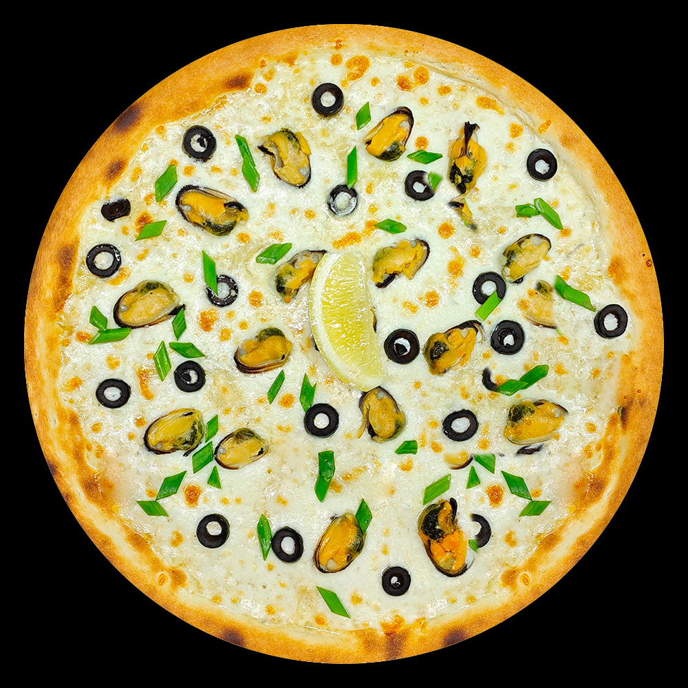 Сочная,ароматная пицца на белом соусе с мидией и кусочком лимона