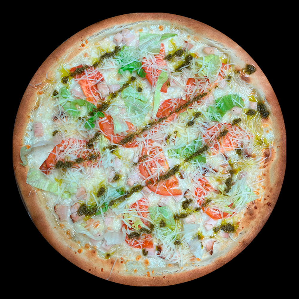 Всеми любимая сочная и свежая пицца на основе курицы,салата айсберг и двумя видами сыра - моцарелла и пармезан политая соусом песто