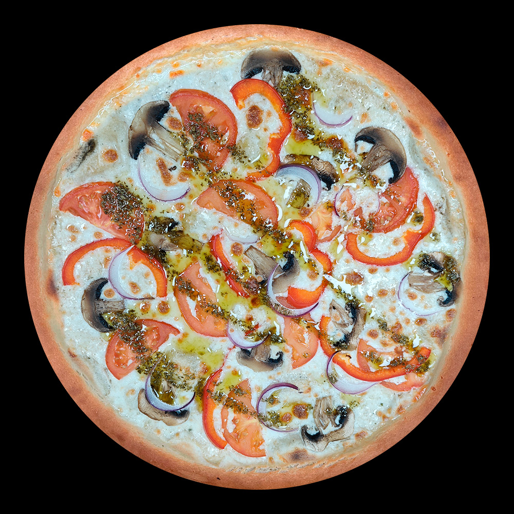 Сочная веганская пицца из свежих овощей на основе белого соуса, для ценителей овощных сочетаний!В составе ялтинский лук, шампиньон, болг.перец, помидор, соус песто.