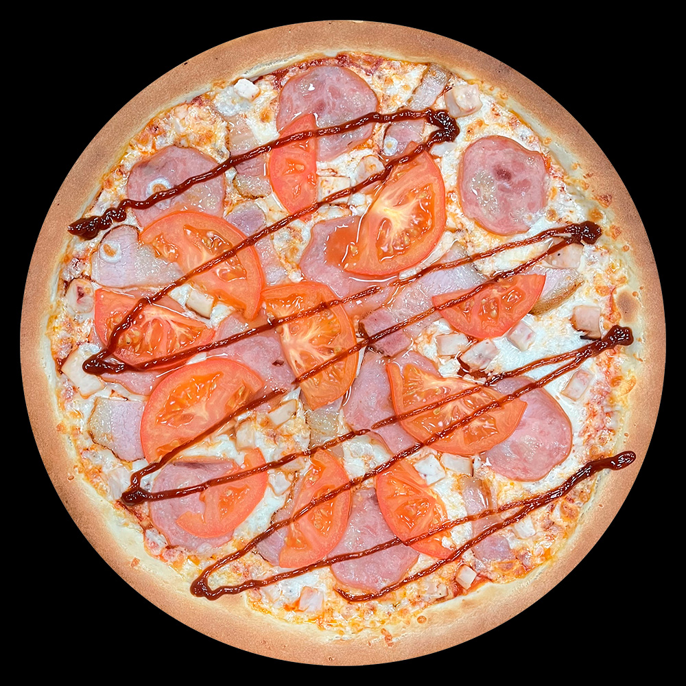Пицца с ломтиками бекона, ветчиной и курицей, с добавлением помидора и полита соусом барбекю