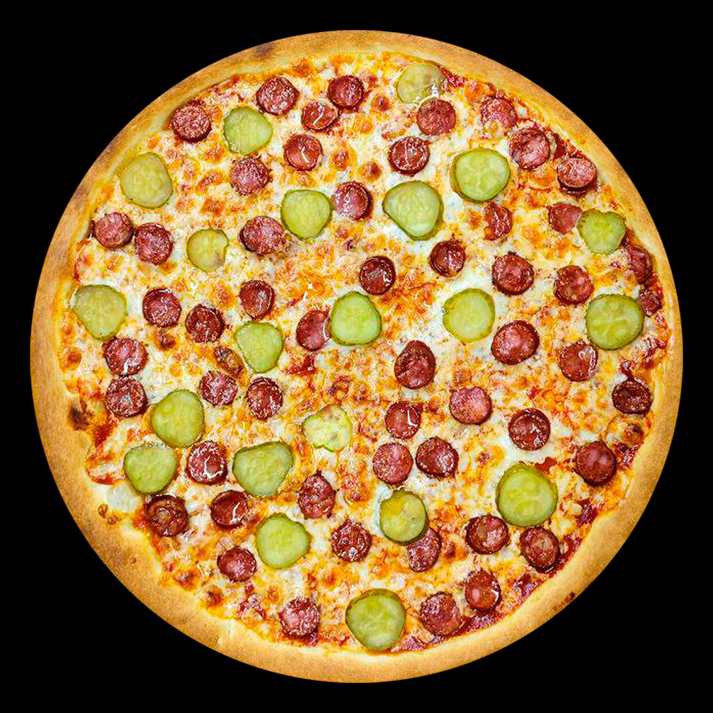 Пицца из вкусных копченых колбасок и маринованого огурчика в любимом исполнении