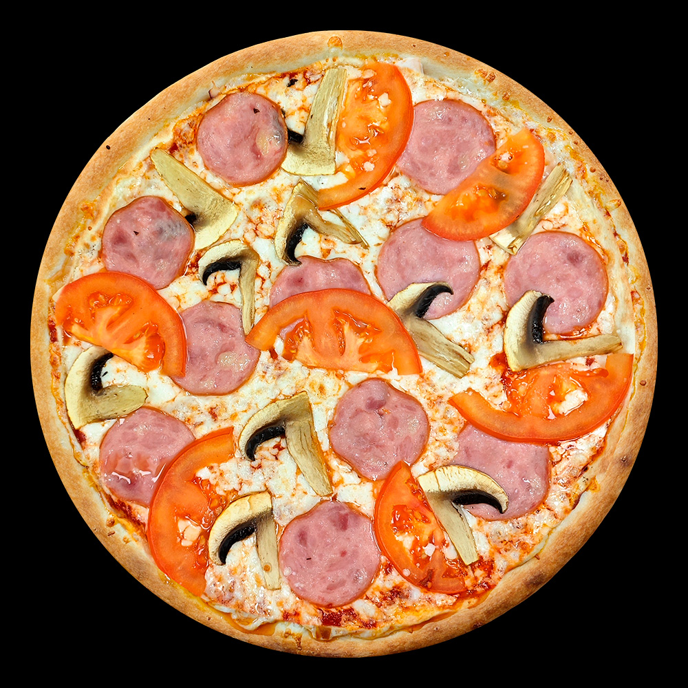 Пицца со свежими помидорами,ветчиной и шампиньоном