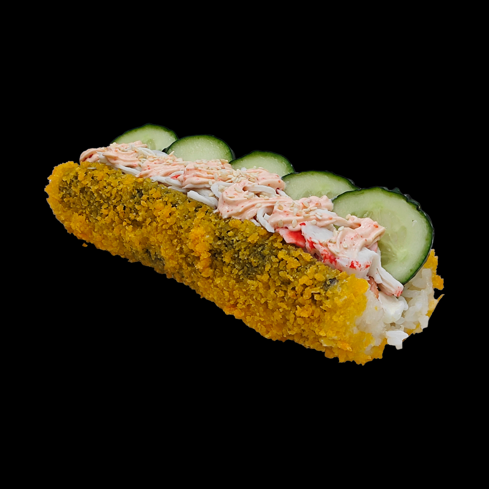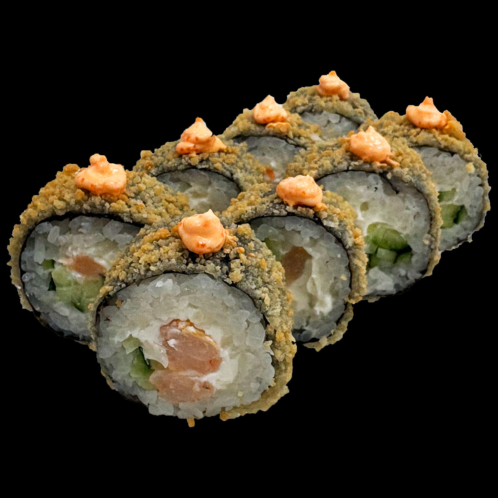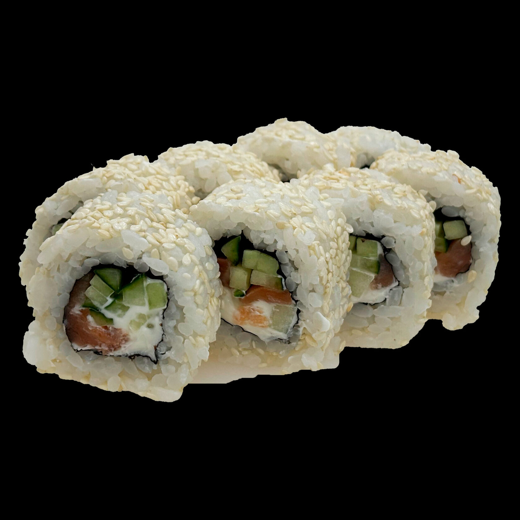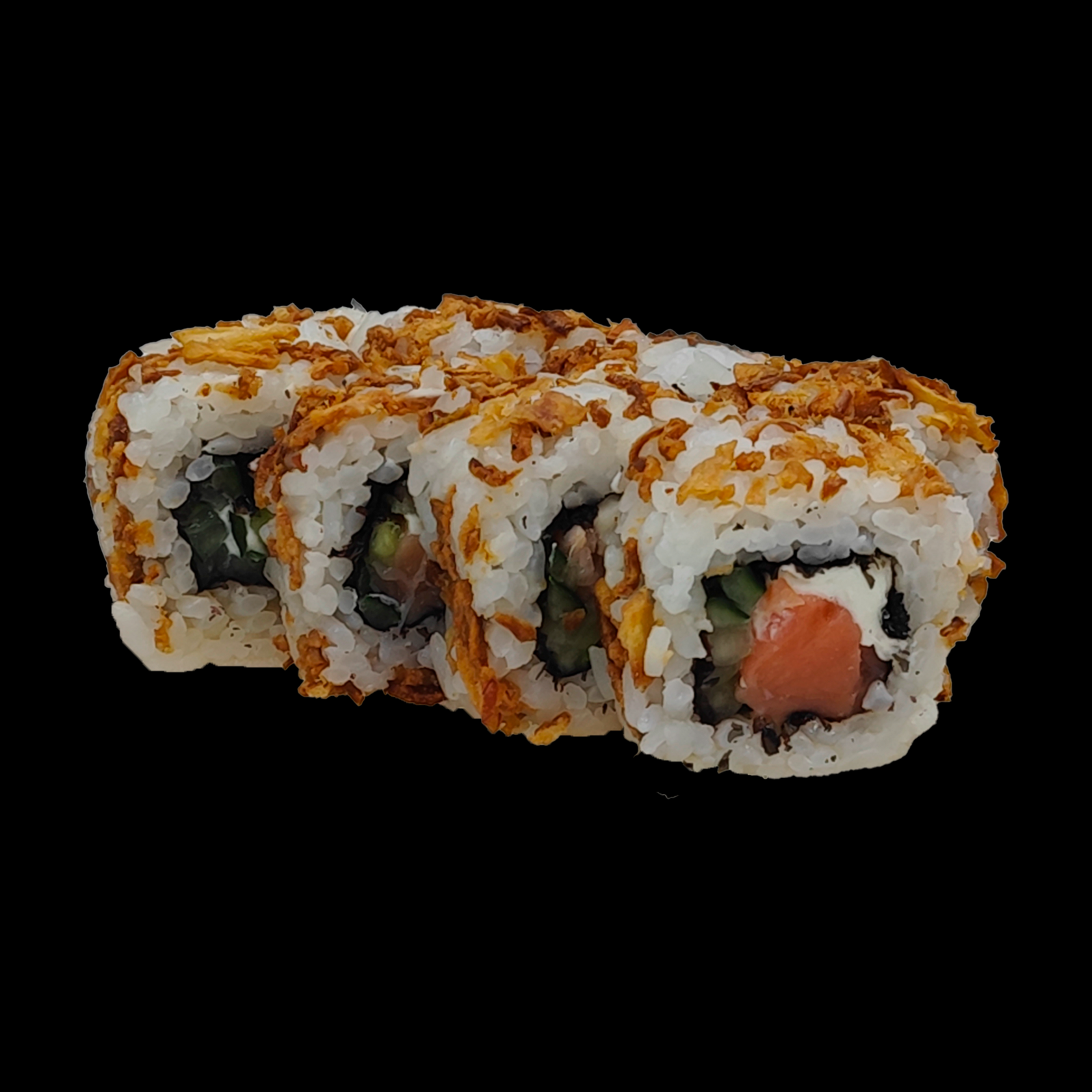 Рис, нори, сыр сливочн., огурец, лосось, снежный краб,спайси соус, кунжут.