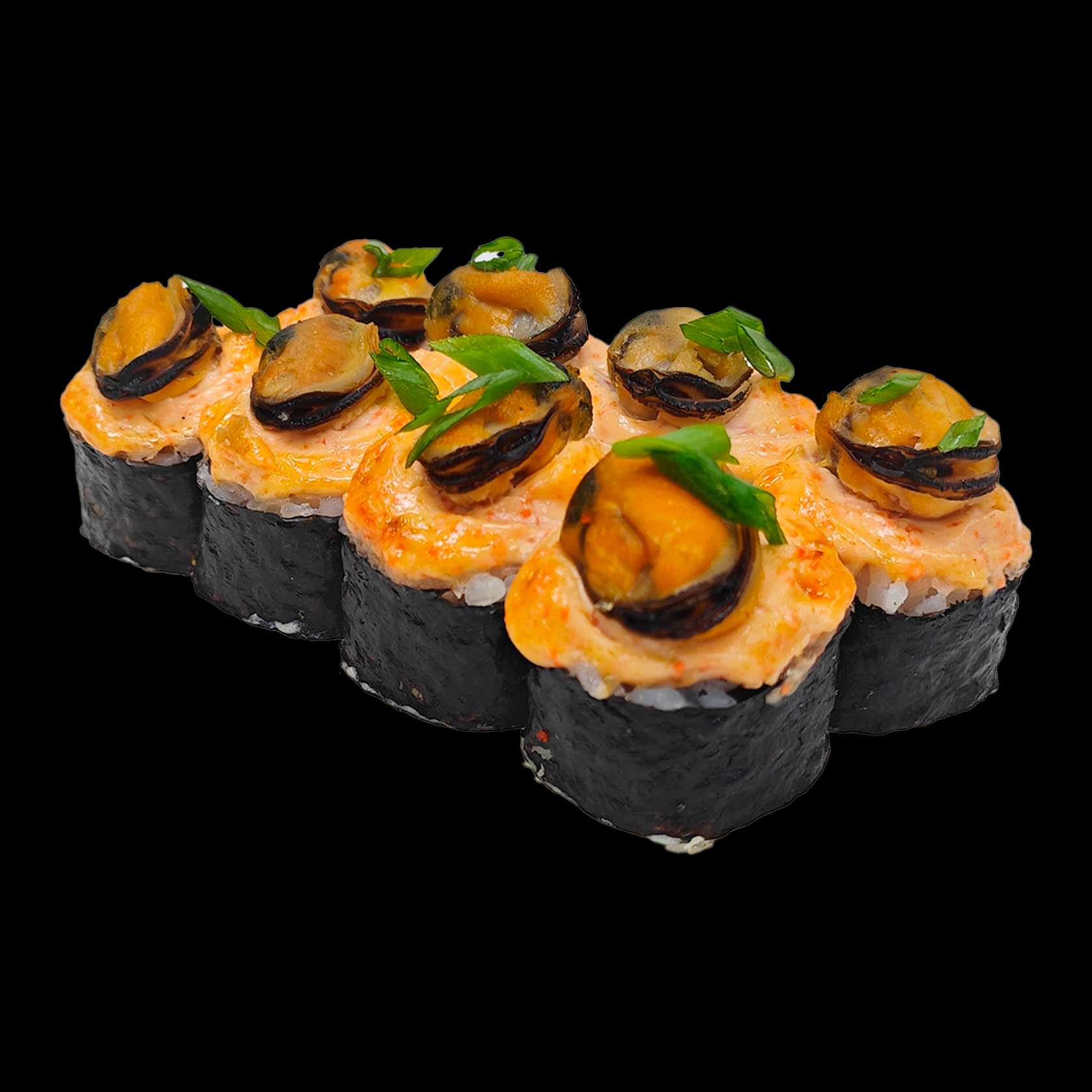 Рис, нори, сыр сливочн., мидия, лук зеленый, спайси шапка.