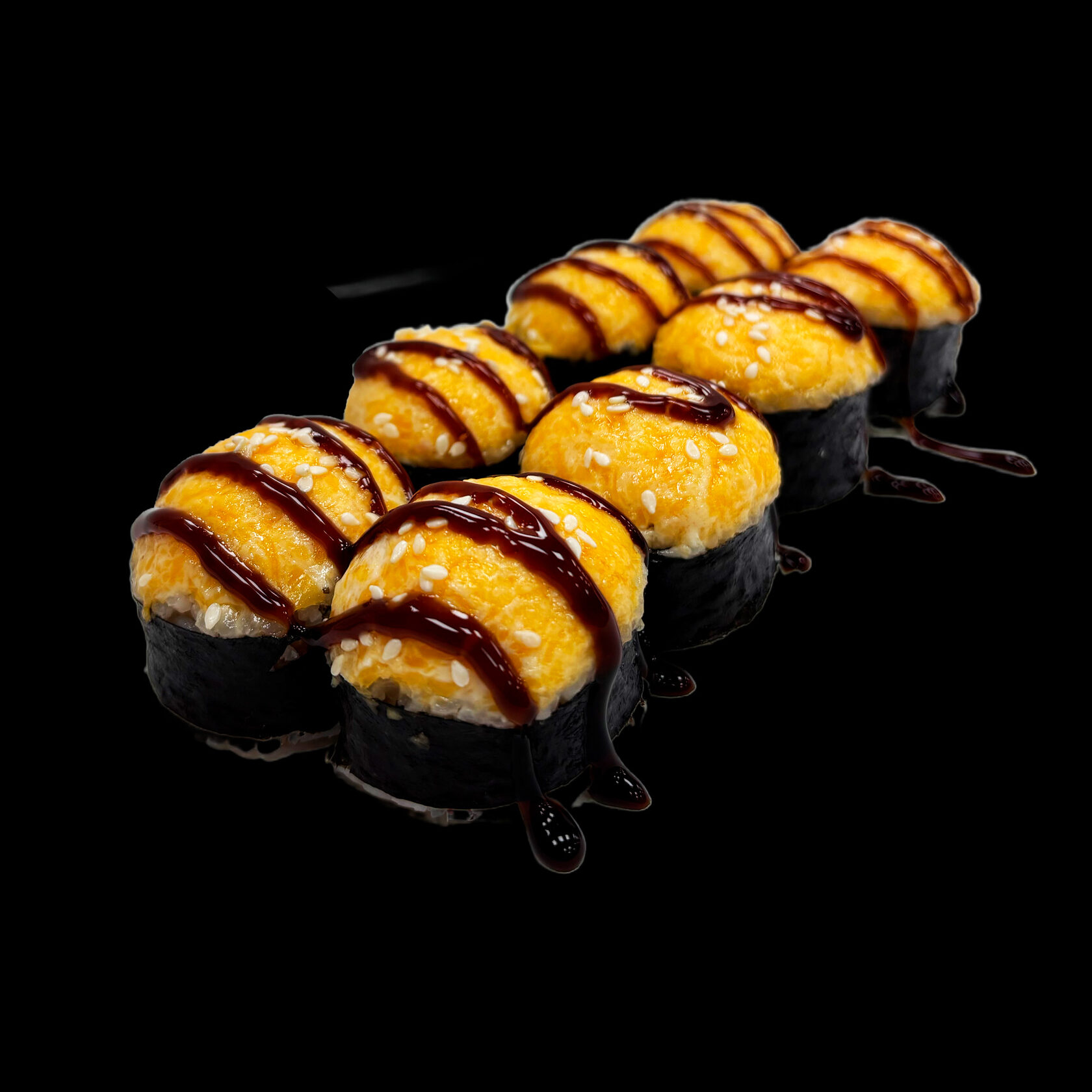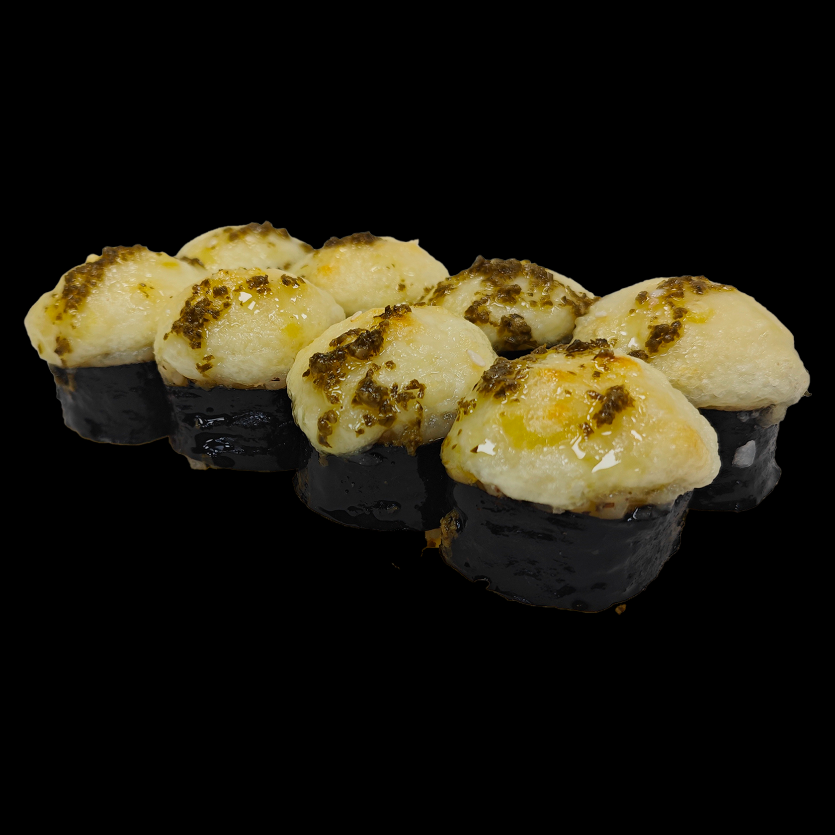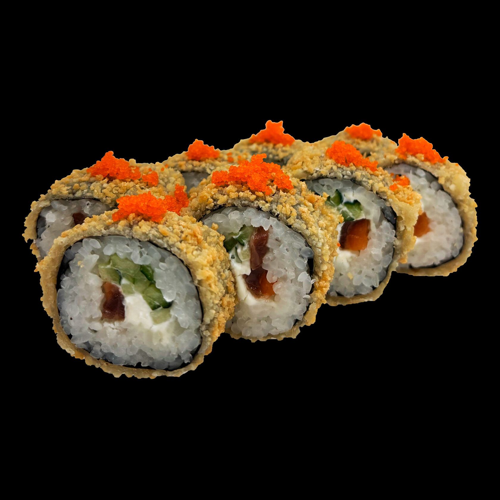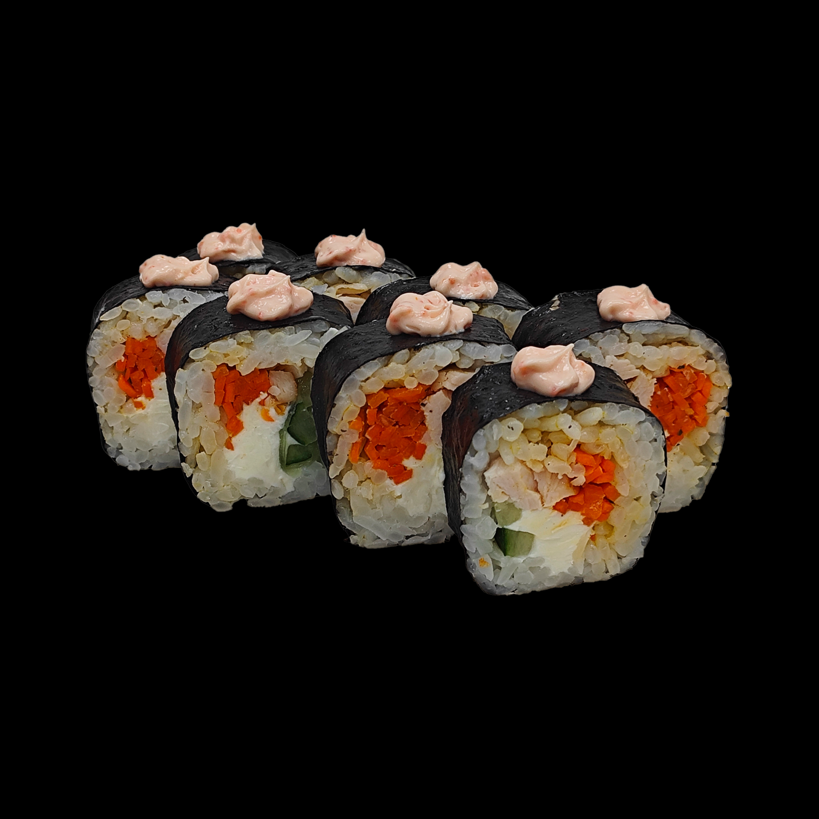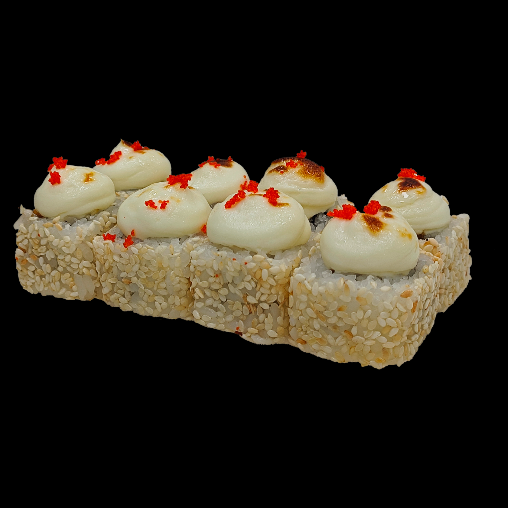 Рис, нори, курица в/к, сыр сливочн.,моцарелла, икра масаго, пармезан, лук криспи.,кунжут