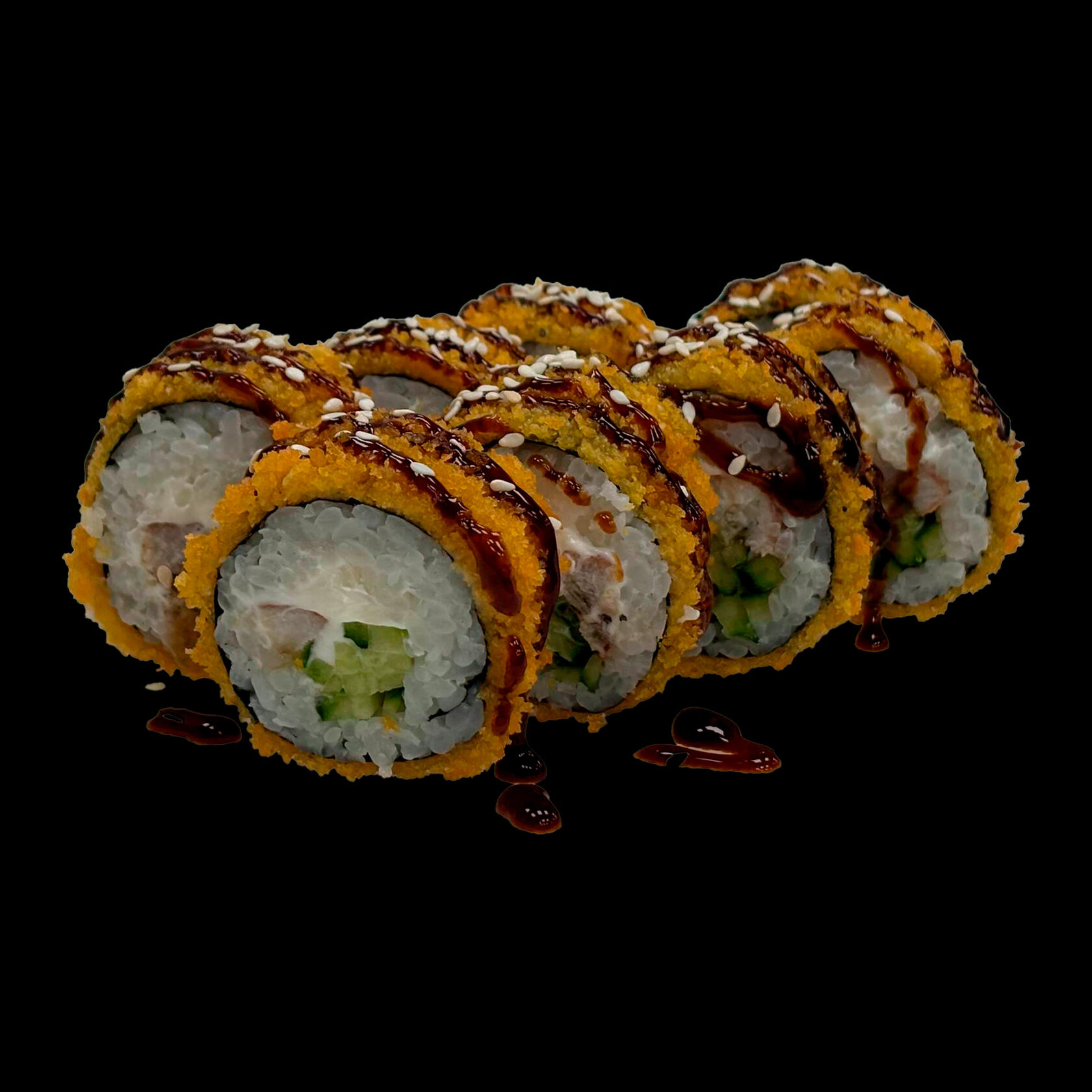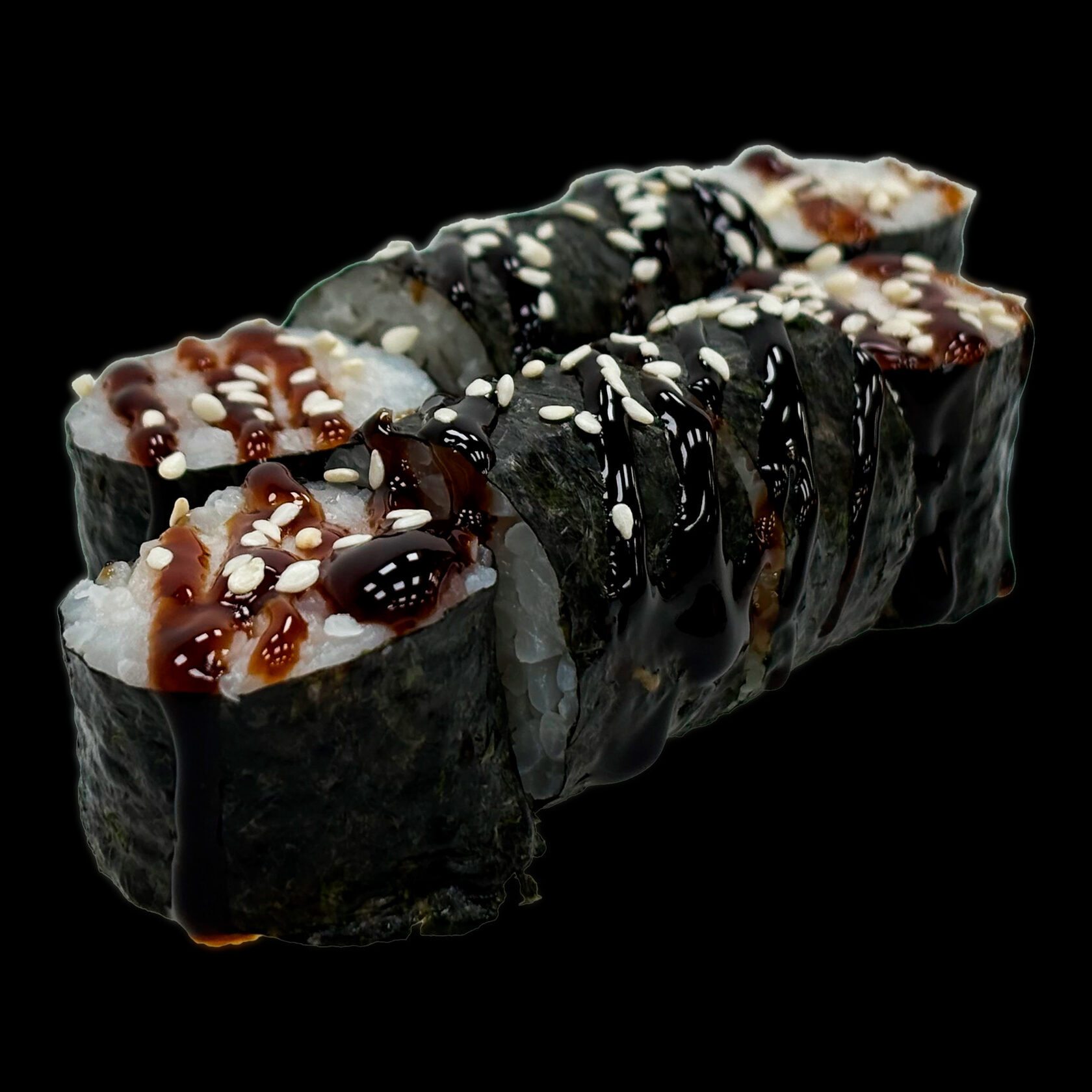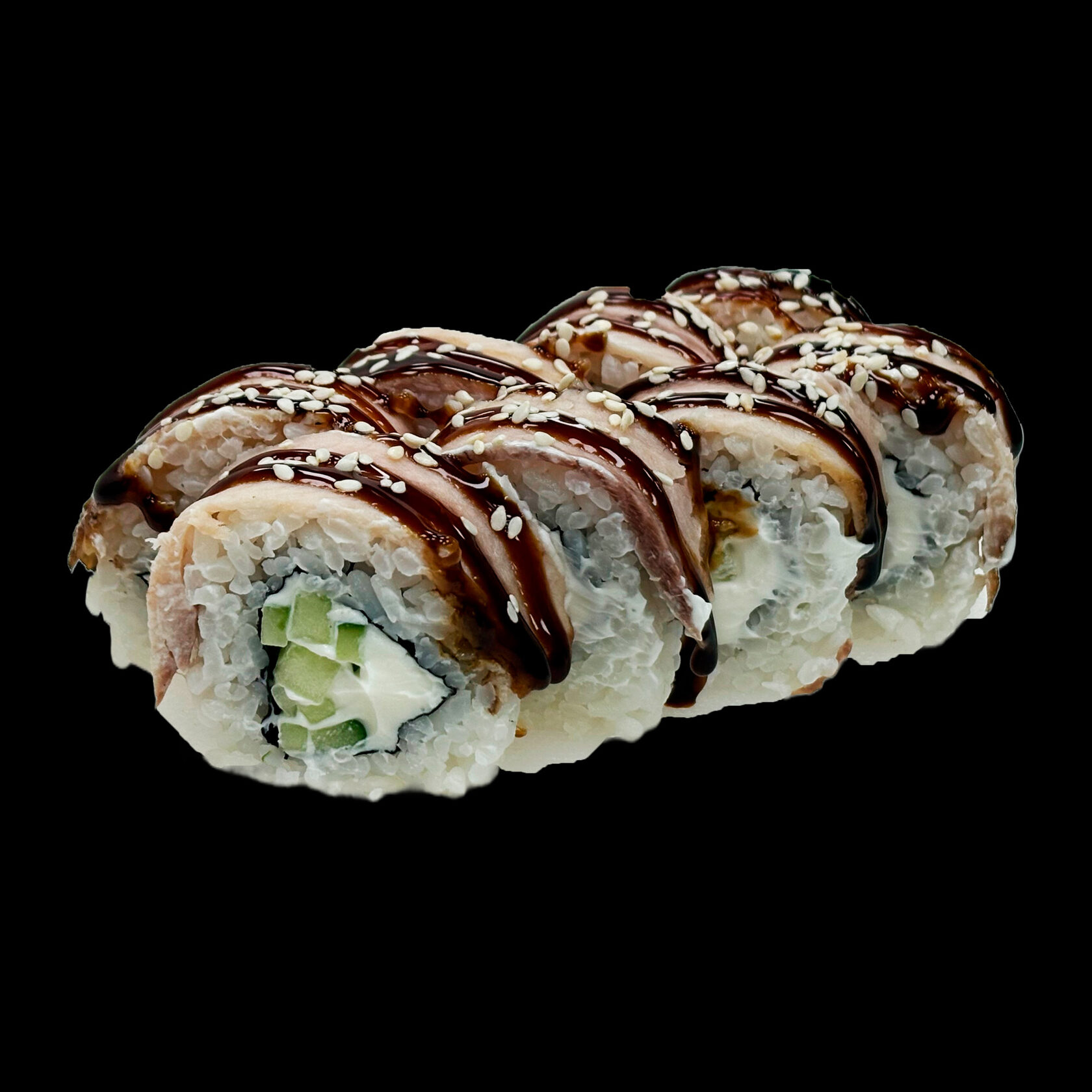 Рис, нори, угорь жареный, сливочный сыр,огурец, соус унаги, кунжут