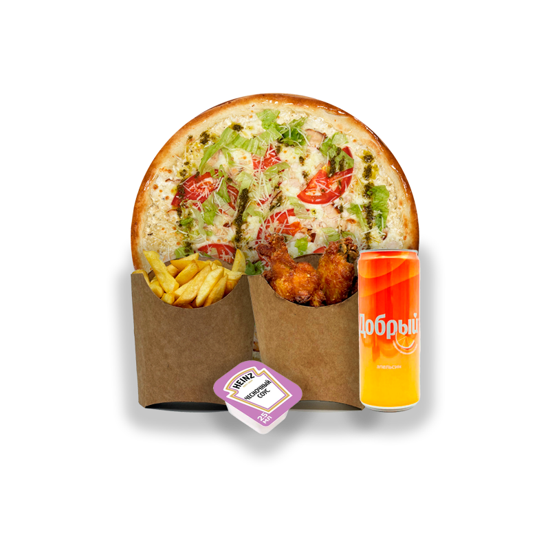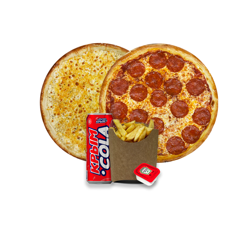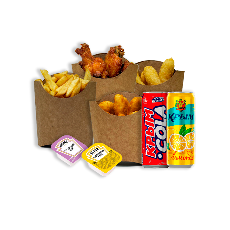 Картофель Фри 100г Куриные Крылья 4 шт Наггетсы Куриные 6 шт Сырные Палочки 6 шт Соус порционный на выбор 2 шт Крым Кола 0,33 - 1шт Крым Лимонад 0,33 - 1 шт
